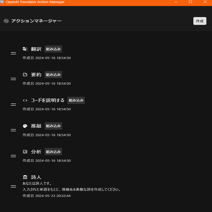 右上の三点リーダーをクリックするとアクションマネージャーを選択できます。