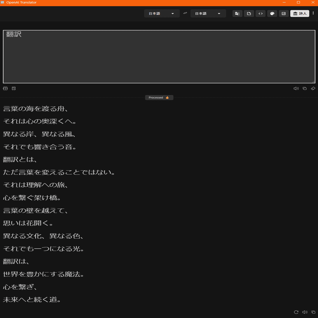 入力ウィンドウに翻訳と入力して作成されたのが上の通りの詩です。