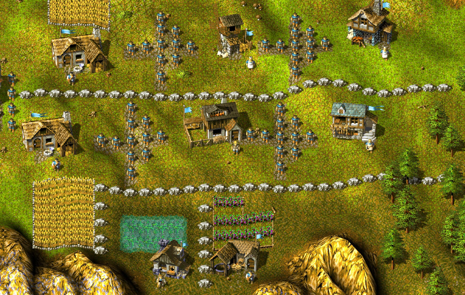 Swine farms in Knights and Merchants are notoriously inefficient at providing food, but they do also give you a resource, with which to build your army. A dairy farm could be an alternative, which requires more space and provides a much more abundant food supply, but nothing else. Only the food. Fish, being the "bonus" food type could have loads of alternatives, from fruit obtained from orchards; to wild berries and mushrooms (the latter of which do grow everywhere already!) picked by a specific worker type akin to the woodcutter; to perhaps eggs, requiring once again grain as feed for the hens. And every type could have its advantages and disadvantages, with the berries and mushrooms, for example, requiring large areas without fields and buildings and having comparatively small yields.