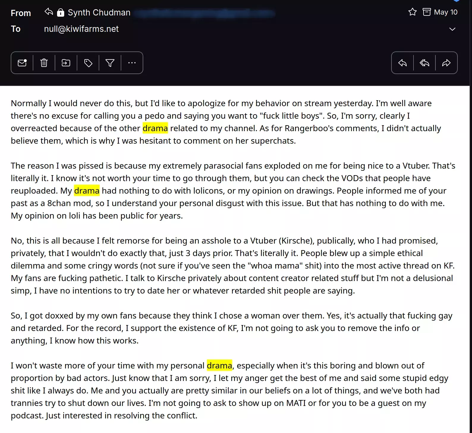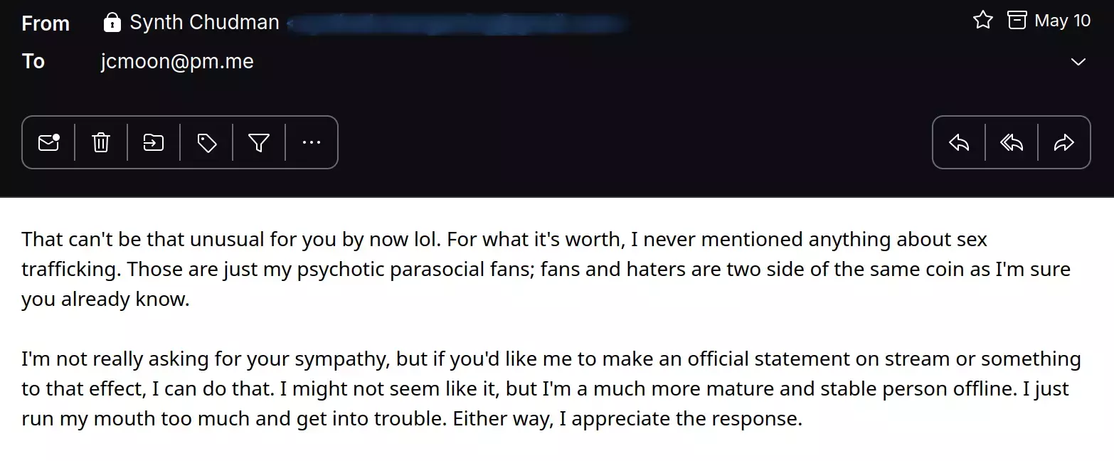 Now dear reader reading up to this point you may have come to the conclusion that this situation was massively blown out of proportion, some nothingburger conversations and cringe moments exaggerated by his extremely parasocial fans to make him seem that he betrayed his revolt against the modern world. And if you came to this conclusion, you're probably right, however, Synths response to this is some true gold.