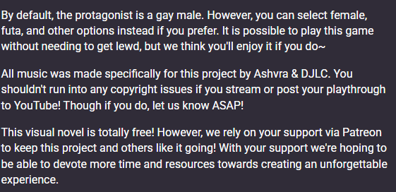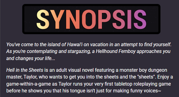 So what is Synth subscribed to? One of his subscriptions is to Night-Fox Works which makes literal gay porn games, the specific project Synth is funding is a game called Hell in the Sheets, which is a gay porn dating sim. Here is the official synopsis.