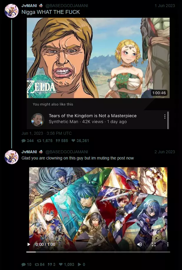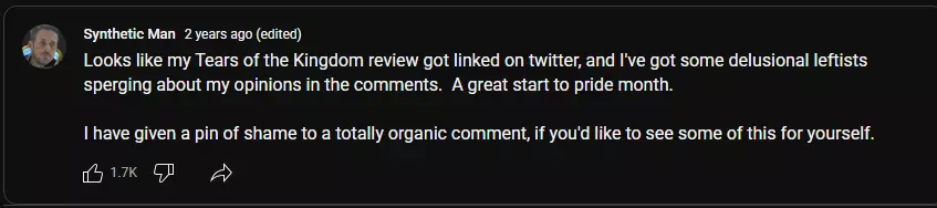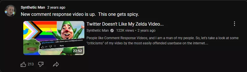 Synth was not having it, and decided to make two community posts addressing it, as well as a response video titled Twitter Doesn't Like My Zelda Video... a few days after his initial review, where he fought with the people who posted, and defended the validity of said schizo tangent.