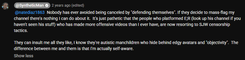 Having read this, you would naturally think that Synth is a member of "The Fandom Menace", a loose collection of anti-woke, center to center-right content creators who are also opposed to the modern state of culture, but you'd be mistaken, as his uncompromising attitude and open disdain for other races (which will be described in more detail later in the OP) has also put him at odds with said group.