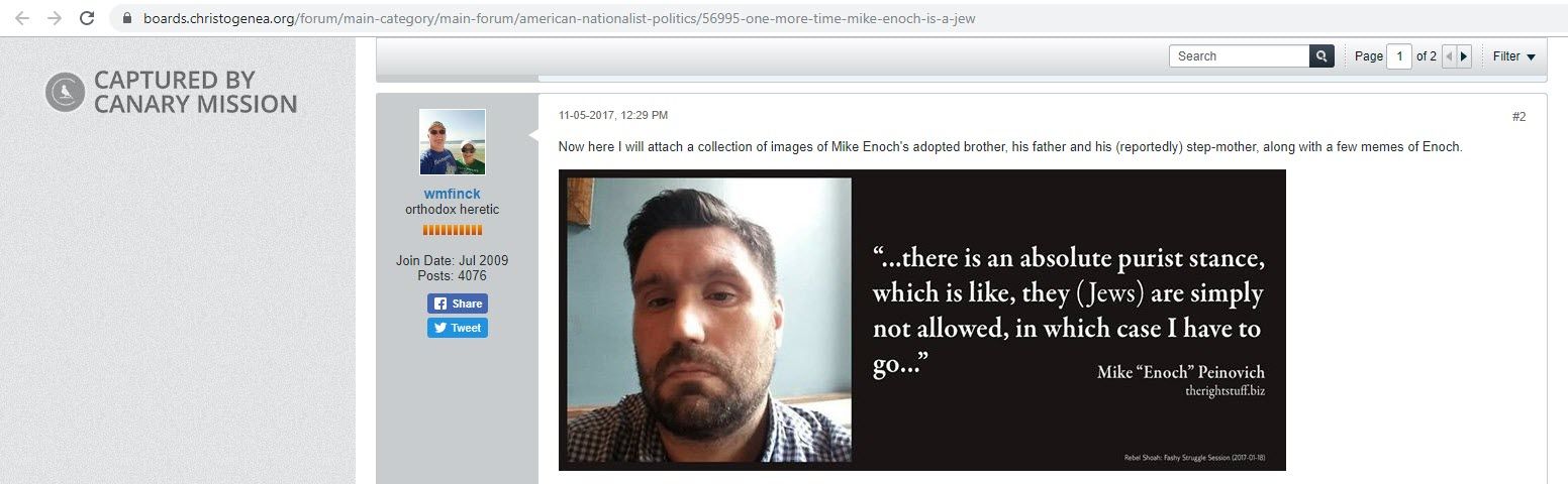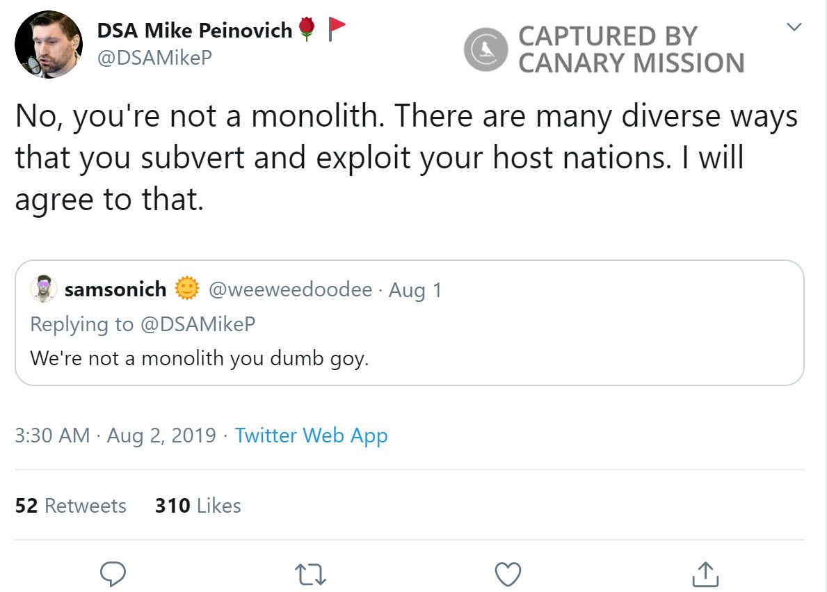 On August 21, 2019, Peinovich tweeted: “Those Jews that vote Democrat have other concerns besides Israel, or that they see as complimentary to Zionism. Like the continued destruction of ethnic majorities in the US and Europe and the promotion of homosexuality.”