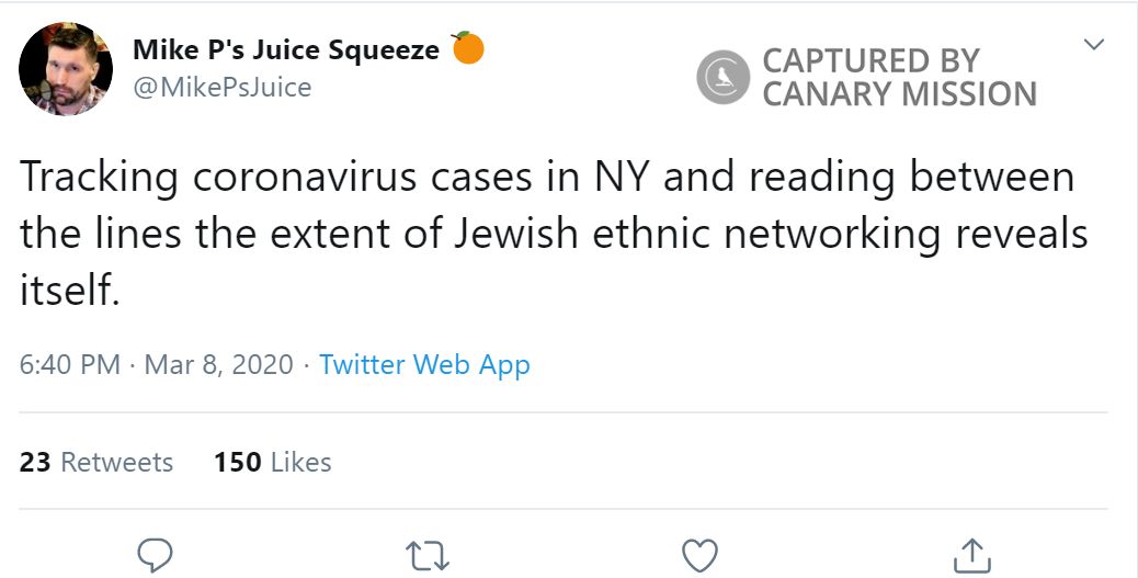 On March 8, 2020, Peinovich tweeted: “Tracking coronavirus cases in NY and reading between the lines the extent of Jewish ethnic networking reveals itself.”