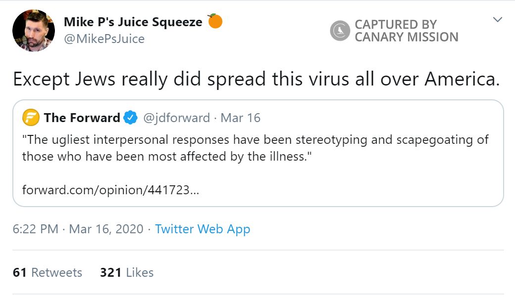 On March 25, 2020, Peinovich tweeted: “Jews are creating coronavirus hotspots, and they refuse to follow instructions to stay the f**k home and not have large gatherings, thus endangering gentiles in surrounding communities.”