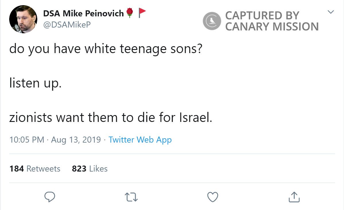 On the same day, Peinovich tweeted: “do you have white teenage sons? listen up. zionists want them to die for Israel.”
