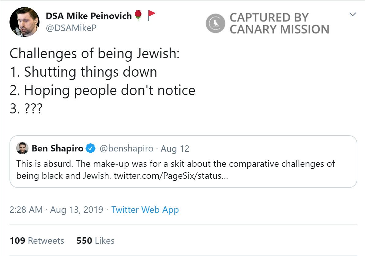 Also on August 13, 2019, Peinovich tweeted: “Challenges of being Jewish: 1. Shutting things down 2. Hoping people don't notice 3. ???”