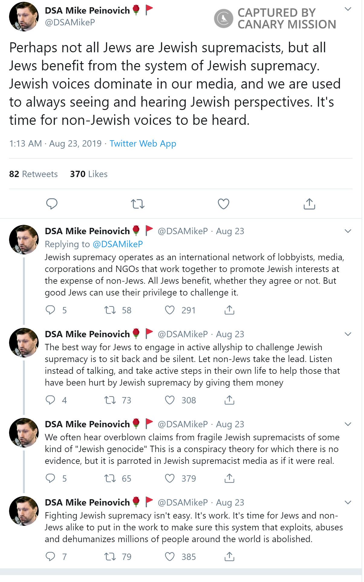 On August 23, 2019, Peinovich tweeted: “Perhaps not all Jews are Jewish supremacists, but all Jews benefit from the system of Jewish supremacy. Jewish voices dominate in our media, and we are used to always seeing and hearing Jewish perspectives. It's time for non-Jewish voices to be heard.”Peinovich continued: “Jewish supremacy operates as an international network of lobbyists, media, corporations and NGOs that work together to promote Jewish interests at the expense of non-Jews. All Jews benefit, whether they agree or not. But good Jews can use their privilege to challenge it.”