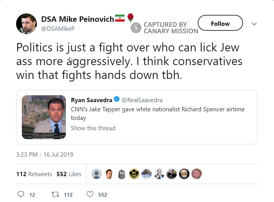 On July 16, 2019, Peinovich tweeted: “Conservatives don’t fear being called racist by the left. They fear getting their money cut off by Jews. They will suddenly get a pair of balls and not care about racism when it comes to attacking Ilhan Omar. Racism in limited form against enemies of Israel is allowed.”