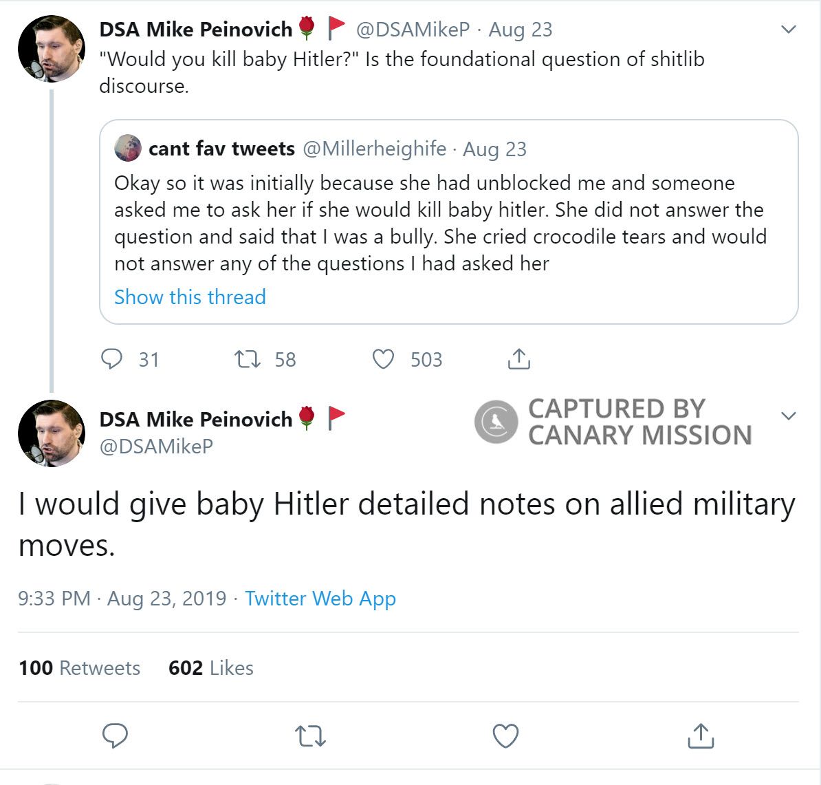 Also on August 23, 2019, Peinovich tweeted: “I would give baby Hitler detailed notes on allied military moves.”