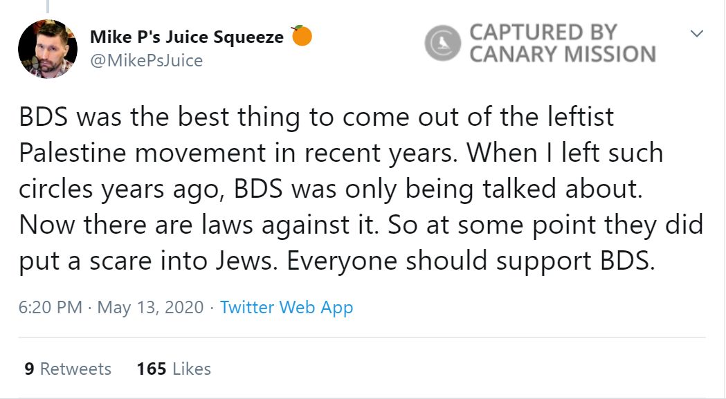 On May 13, 2020, Peinovich tweeted: “BDS was the best thing to come out of the leftist Palestine movement in recent years. When I left such circles years ago, BDS was only being talked about. Now there are laws against it. So at some point they did put a scare into Jews. Everyone should support BDS.”On the same day, Peinovich tweeted: “The idea that a US citizen cannot boycott Israel and still do business with their own government is intolerable.”