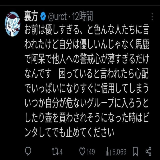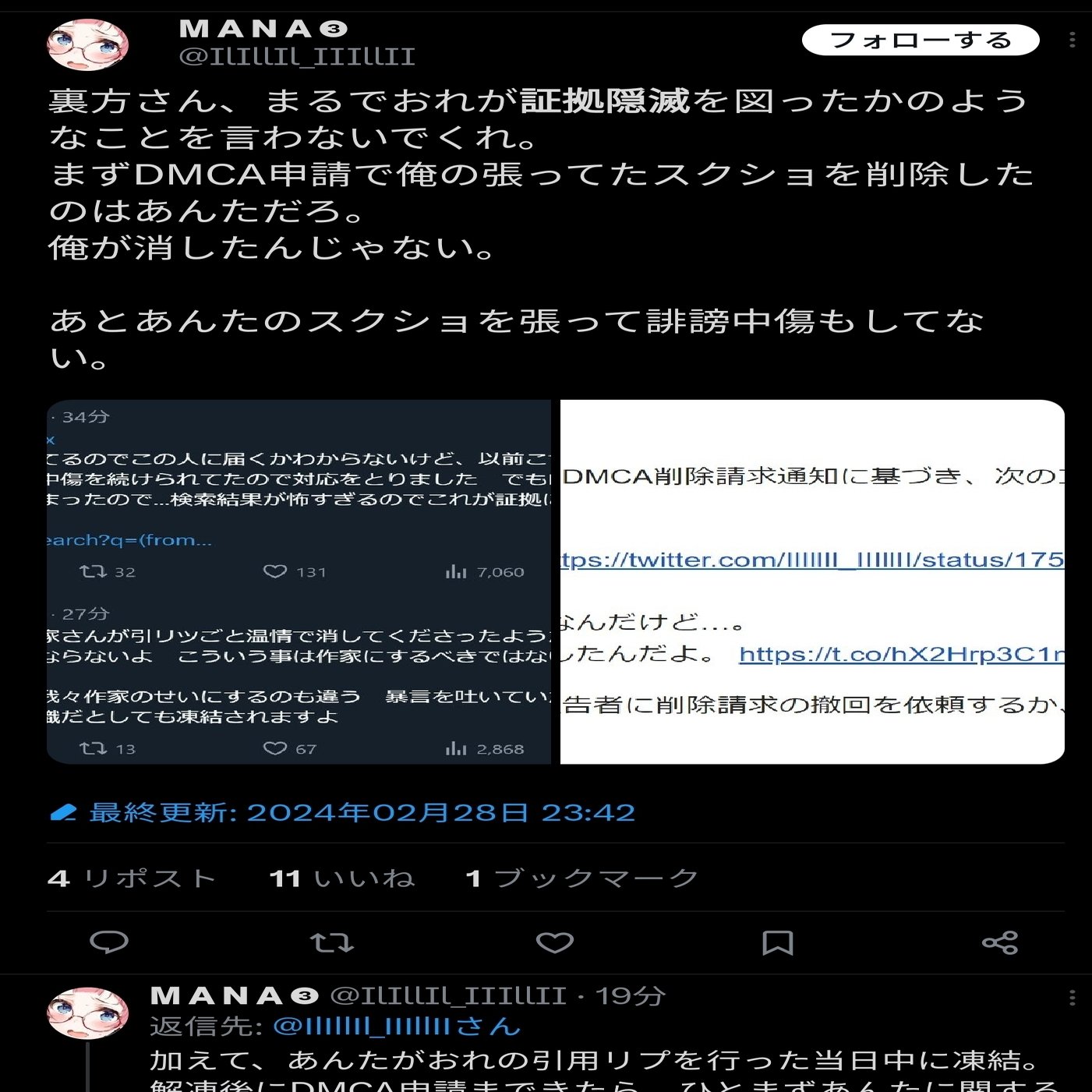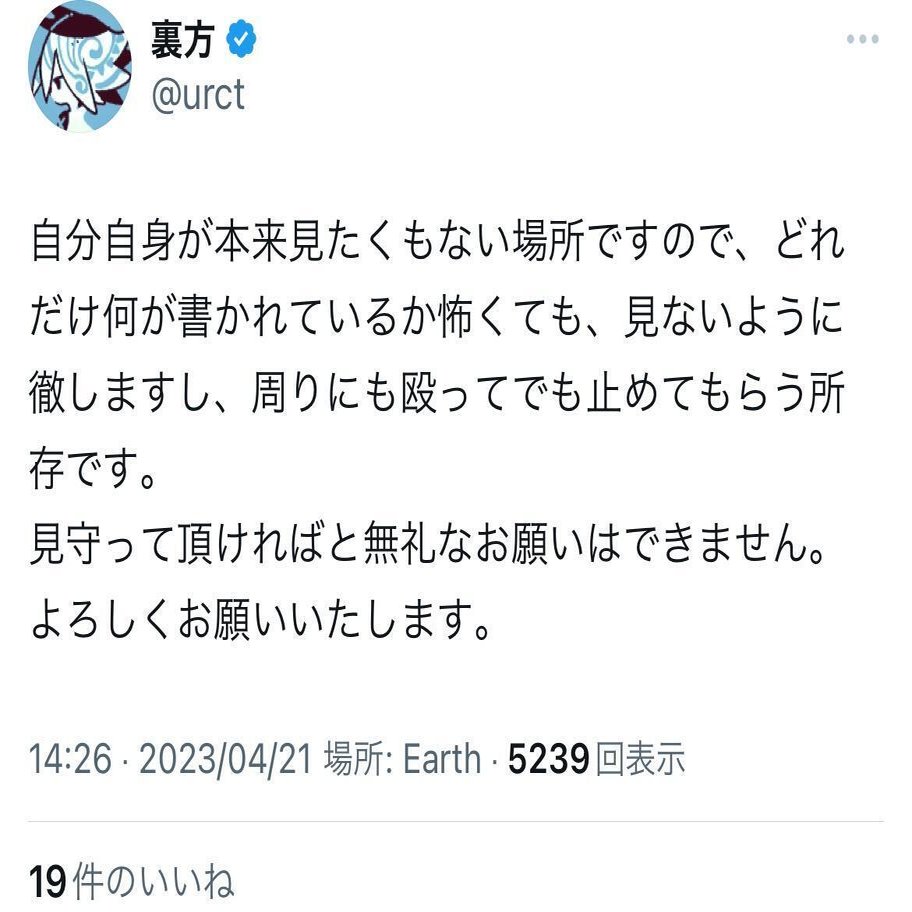 吉川氏を凍結させたに飽き足らずその副アカウントにも脅しをかけて凍結させようというのは見てて呆れ返りましたね… 13:55〜15:00の間しかポストが存在せず幻の脅迫ですが。 おそらくこういったことは常習化していたと疑っています。じゃないとあのポスト数の少なさも説明つかないです。 私は裏…