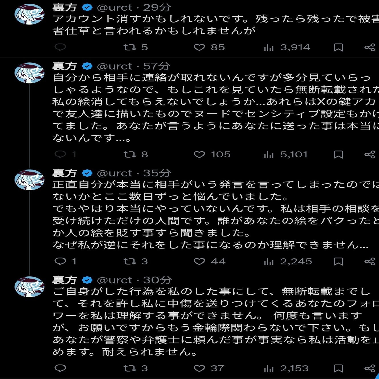一部相手は匿名で中傷を繰り返し行なった事が判明し昨年迄に法的な措置を含む対応をし、いずれの相手からも誠実な謝罪を受けました。全ては相手の行為から始まったものです。相手のファンなら尚の事本件に関する言及はおやめ下さい