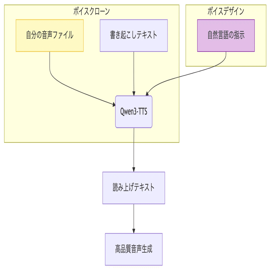 技術的な12Hz圧縮による高速処理や、自然言語で声を設計できる「ボイスデザイン」機能など、新しい試みも盛りだくさん。MacのM4のような最新PCであれば、ローカル環境でも十分なスペックで動きますし、Claude CodeなどのAIツールを活用すれば導入も簡単です。