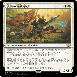 そんなスタッツの懸念を強く払しょくするのが、次に挙げるロードである。現代の多くのロード(種族全体強化)やアンセム(自軍全体強化)が3マナなのに対し、「鳥」は2マナの《冒険呼び》を使うことができる。