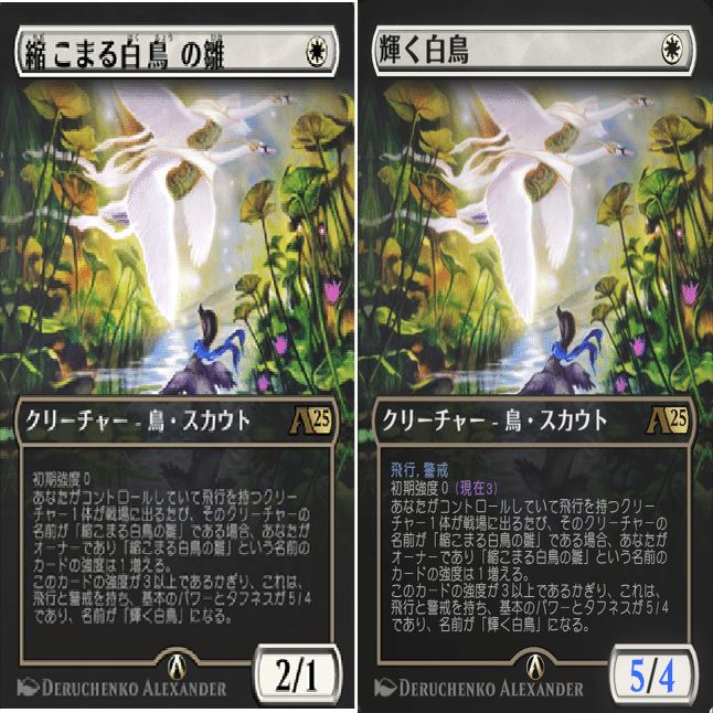 最強の鳥。たぶん「みにくいアヒルの子」モチーフと思われるが、その通りに飛んでるヤツらを3回見ると見事に成長する。そのスタッツたるや5/4飛行警戒。1体がそうなると2体目3体目も成長した状態で出てくる。すごい。