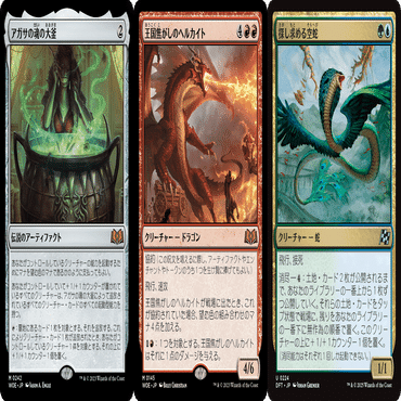 ・訓練士がおらず新緑の起動を連打するしかないケースで、このターンに大釜を起動済且つ手札に別の大釜+唱えられる2マナがあるなら勝ち手段(ヘルカイト・タイヴァー)は裏向きで出さずに墓地に落とせば、大釜①で無限マナを出してから大釜②で勝ち手段を追放してそのターン中に勝てる。