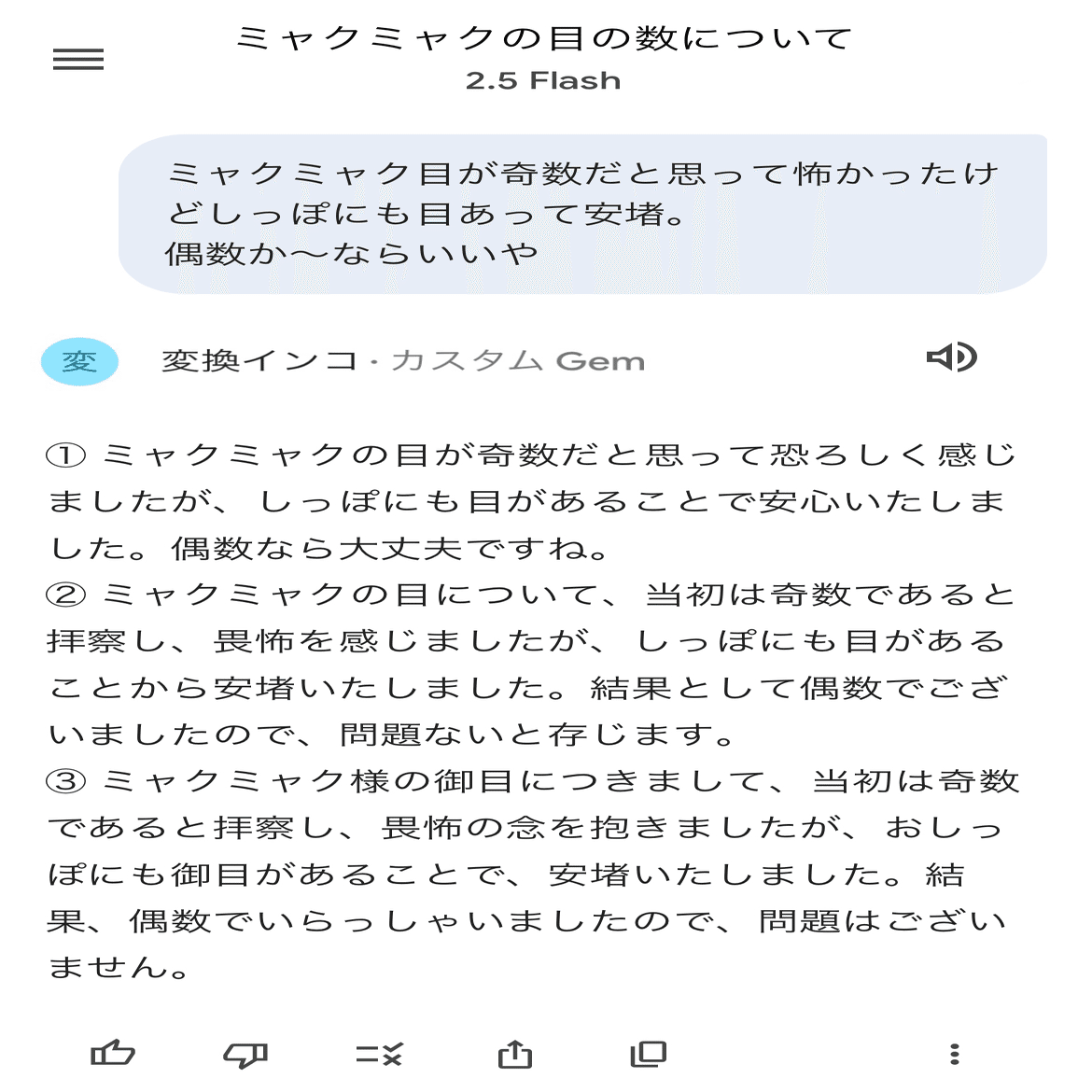 Geminiには指示を保存しておける“カスタムGem”という機能があるので、星新一のインコを再現してみました。プロンプトはこんな感じ。丁寧度順に3種類出てくるようにしました。