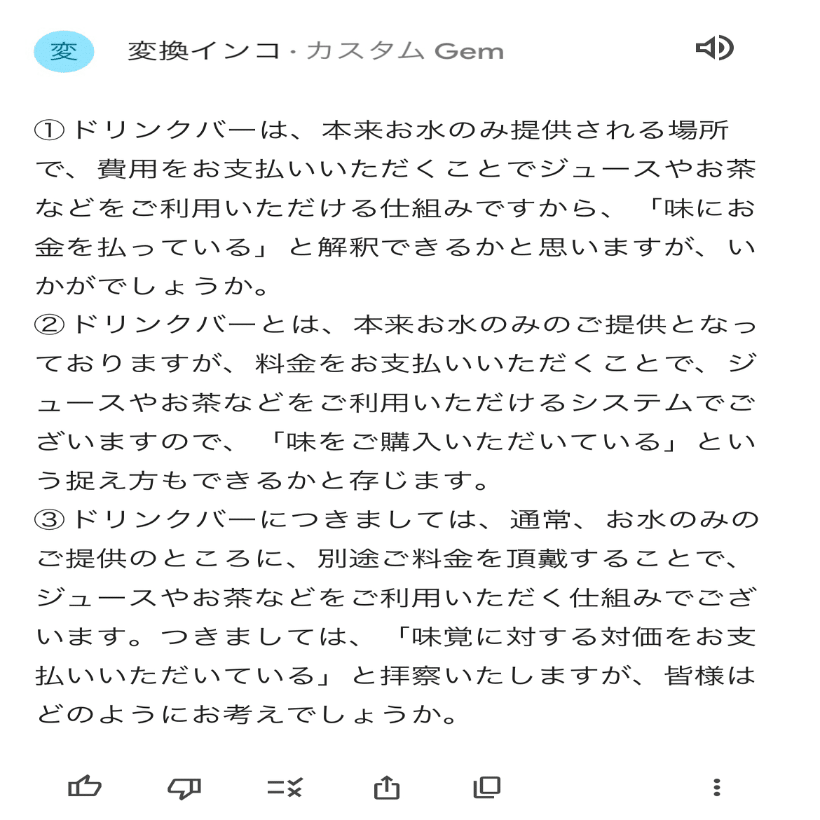 ドリンクバーって、本来水しか飲めないところをお金を払うとジュースなどが飲めるようになるシステムですよね。つまり味付きの水が飲めるわけです。これはもう「味を買っている」ことになるのでは?顧客に聞きたい。絶対聞きたい。どうしたらいいだろう?