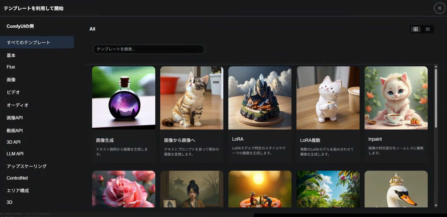 ComfyUIのアップデートで追加された新しいボタン。既に構築されたワークフローのテンプレートを目的・種類別に検索することができる。EasyWan22で初めてComfyUIをインストールした人も、こちらから必要なワークフローを探すことでForgeなどと同様に静止画生成やインペイントなどの作業を行える。そのまま使うというよりは、自分でワークフローを構築したいときに0からノードを並べるのではなく、これらをテンプレとして改造する用という感じ。