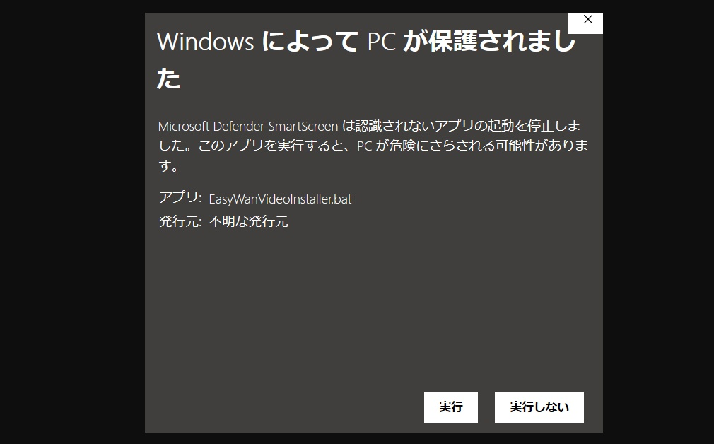 「WindowsによってPCが保護されました」と表示されたら、「詳細表示」ボタンを押してから「実行」します。(下記はEasyWanVideoの警告文スクショです)