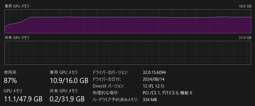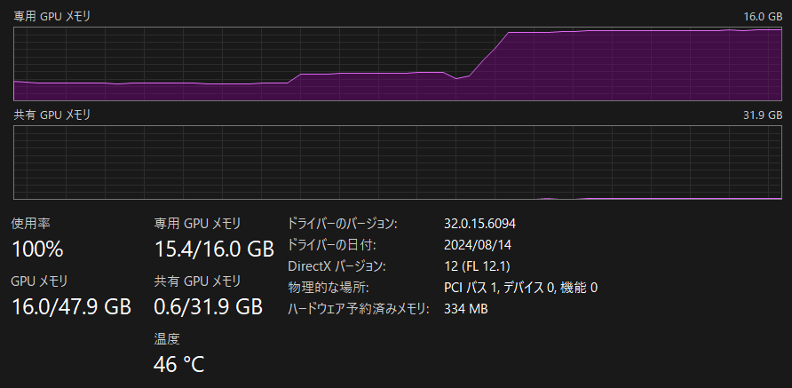 ▲正常例。専用GPUメモリ(グラボのVRAM容量)の範囲で生成が行われている