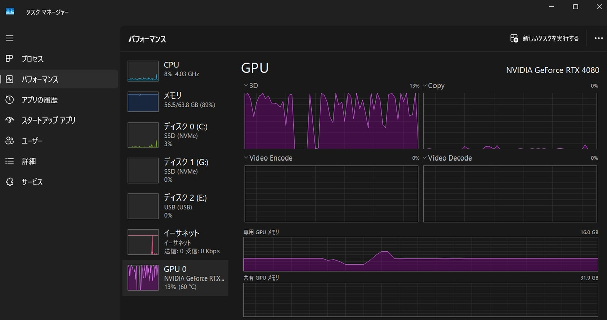 ▲メインメモリ64GB、グラボはRTX4080(VRAM16GB)