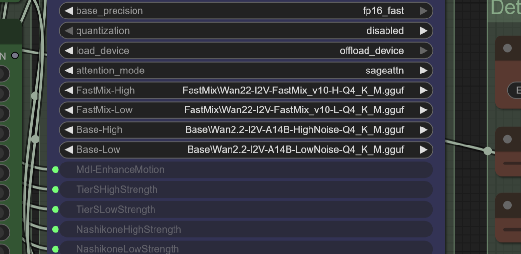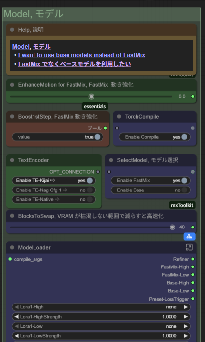 動画生成に使用するWan2.2系モデルの種類を変更できる。デフォルトは快速カスタム版の「FastMix」が選ばれているが、より高品質だが動作の重い「Base」に変更することもできる。