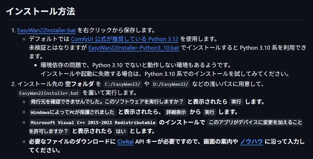下記に引用したインストール案内が非常に親切ですので、熟読しましょう。こちらに書かれている通り、「EasyWan22Installer.bat」を右クリックし、「リンク先を名前を付けて保存」します。