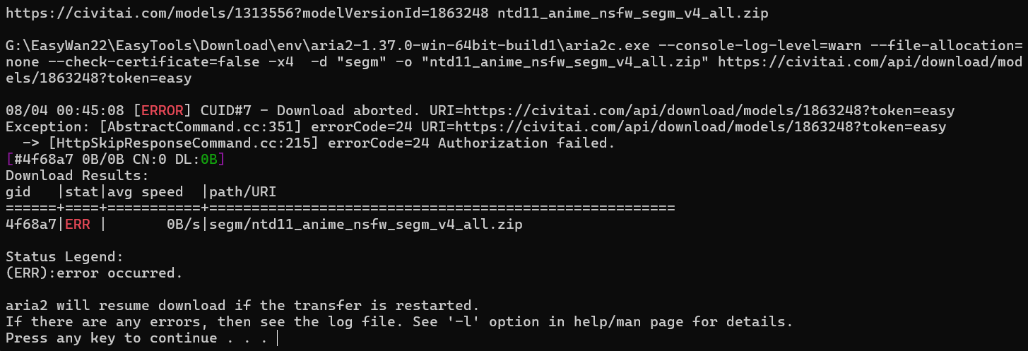 途中でこのようなERRORが出た場合、「君が指定したAPI Keyが間違ってて、CivitaiからのファイルDLに失敗したけど?」という意味です。