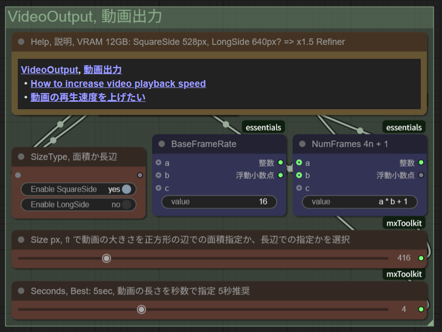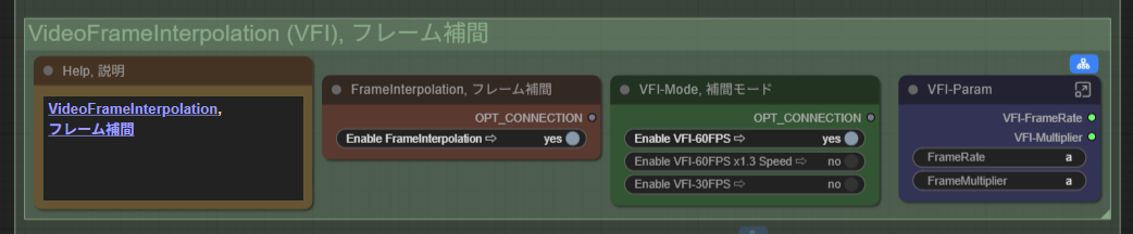 生成した動画のアップスケールやフレーム補間(ヌルヌル化)、モザイク処理など、仕上げ段階処理を行うノードです。動画生成には大きなVRAM負担と時間が掛かるので、基本的には毎回後処理を行うことはせず、試行錯誤で良いwebpが出せてから、最後に高品質にするやり方が効率的です。