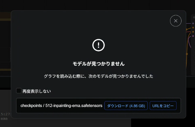 初めて読み込んだワークフローでは基本的に「必要なモデルがComfyUIのフォルダにない」という趣旨のエラーが出るので、ダウンロードボタンからDLするか、指定されているフォルダに同名で保存しよう。