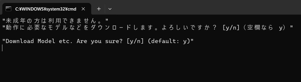 続いて黒いコマンドプロンプト画面が開き、最初にこう聞かれるので、自らが成人であることを誓いつつ、「y」と入力し、ENTER。
