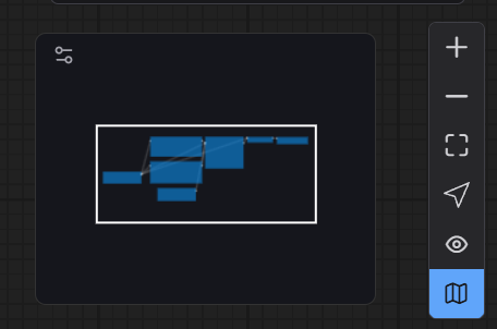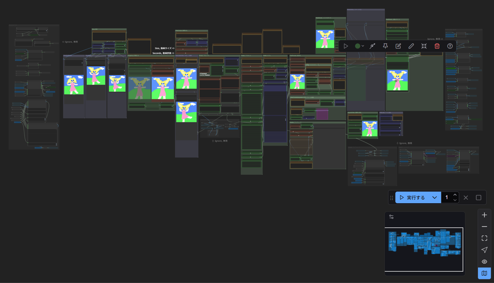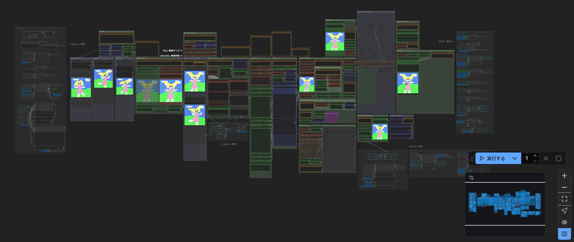 横の「+」「ー」でズームイン・ズームアウト。四角いボタンでワークフロー全体を表示します。その他のボタンでノードを繋ぐリンク(線)を見えなくしたり、ミニマップを非表示にしたりできます。