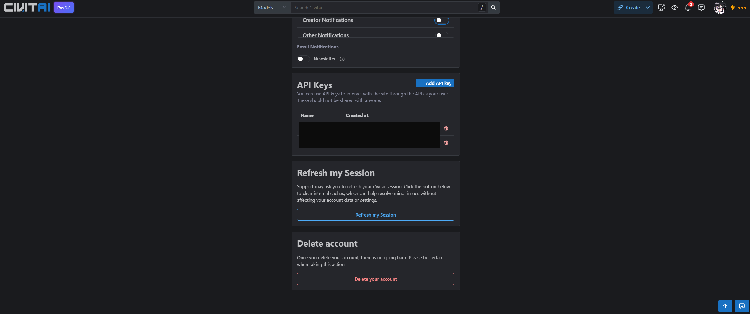 ここを読んでいる方でCivitaiのアカウントをまだ持っていない方はいないと思いますが、まだの方はアカウントを開設した上で、「https://civitai.com/user/account」にアクセス。下の方へスクロールすると、API Keysというタブがあるので、「+Add API Key」ボタンを押します。
