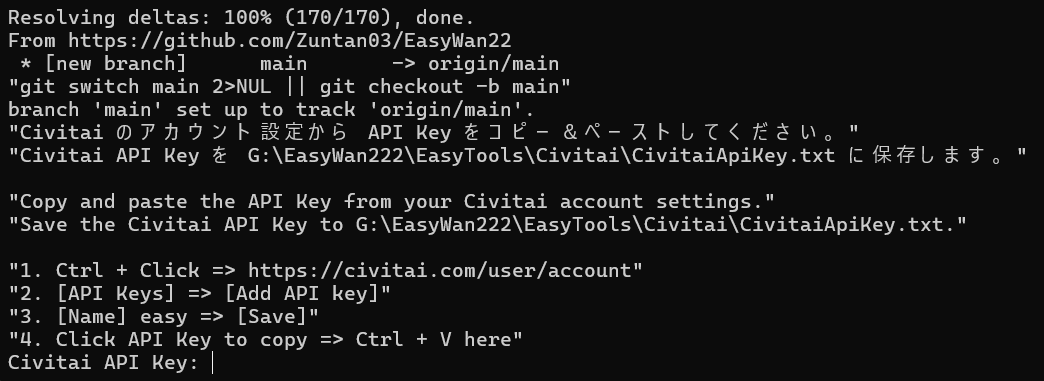 するとこのようにずらずらと導入が始まりますが、すぐに停止して「Civitaiのアカウント設定からAPI Keyをコピー&ペーストしてください」と要求されます。これは、「必要なファイルをCivitai上からDLしてきてあげるから、あなたのアカウントの許可を示すパスワードを入力してください」という意味です。(Civitaiは、画像・動画系生成AIのファイル共有プラットフォームです)