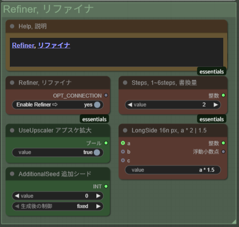 ・「UseUpscaler」:Refinerを掛ける際にアップスケーラーを掛けるかどうか指定するノード。デフォルトはON。