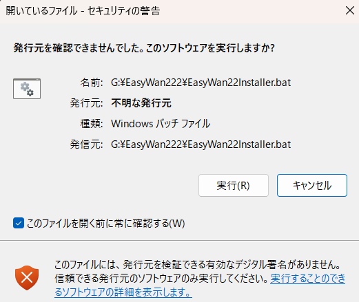 あとは上記に書かれている通り、EasyWan22Installer.batをダブルクリック。このような警告画面が出たら「実行」します。