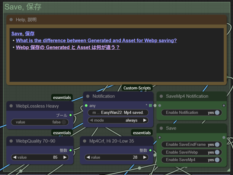 これらは、動画生成時に「動画の最終フレーム画像」「ワークフロー情報を含むwebpファイル」「動画ファイル(mp4)」をそれぞれ保存するかどうかを設定する重要ノード。ON(yes)にしたものは、easywan22\Outputフォルダ内に日付別に出力されます。