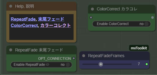 H動画を生成する際に、局部を検知して自動モザイクを掛けてくれるノード群です。「PointMosaic」「MaskMosaic」「AutoMosaic」の3つの欄に分かれており、それぞれ任意指定・半自動検出・自動検出でモザイクを掛けられます。こちらもアップスケールと同様、毎回モザイクを掛けると大変ですので、完成品(それもR-18の…)を作るときだけONにしましょう。