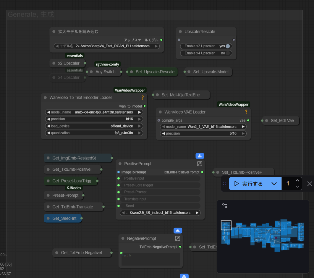 LoRAを含めた、動画生成に使うモデルを選ぶノード。プリセットにないLoRAをCivitaiなどから手に入れた場合、こちらから「High」と「Low」それぞれのLoRAを読み込んで使う。トリガーワードも自分で「PositivePrompt」ノードに入力する必要があります。例えば、汎用挿入プリセットで適用できる「GeneralNSFW」LoRAなら、「ntsfsks」と入力する(※ぶっちゃけ、入力しなくても効くようだ)