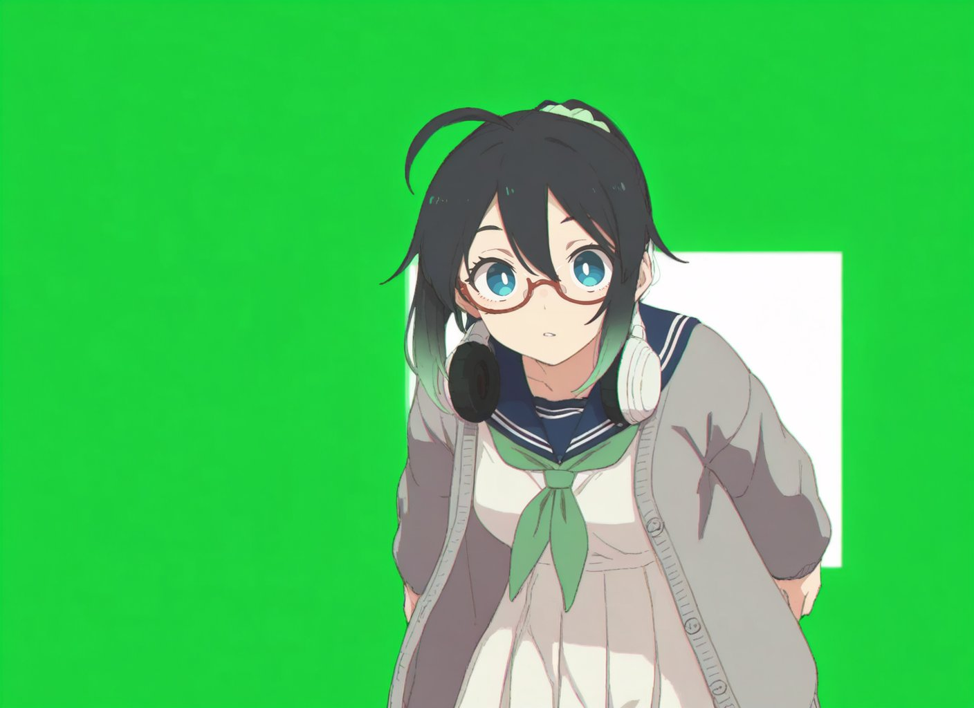 主題:「An anime girl with a ponytail tied with a mint green scrunchie, red glasses, and wearing a sailor school uniform with a grey cardigan」