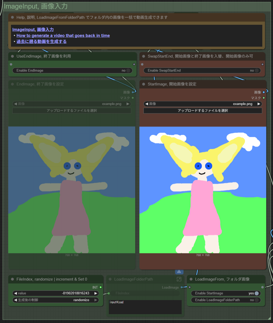 「SaveEndFrame」 をオンにすると、動画の最終フレームを静止画として保存します。これを次の開始フレームとして使えば動画の続きを生成できますし、視点・終点を固定したまま中間動作だけを変える応用も可能です。