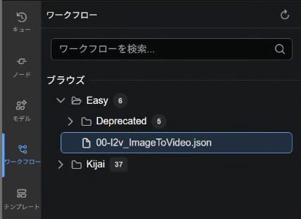 画面左のバーからファイルの形をしたボタンを押し、ワークフローを呼び出します。「Easy」というフォルダ内を開きましょう。記事執筆現在のバージョンでは、この「00-I2v_ImageToVideo.json」というワークフローがimage2video生成用に用意されたEasyWan22のスタンダードなワークフローです。