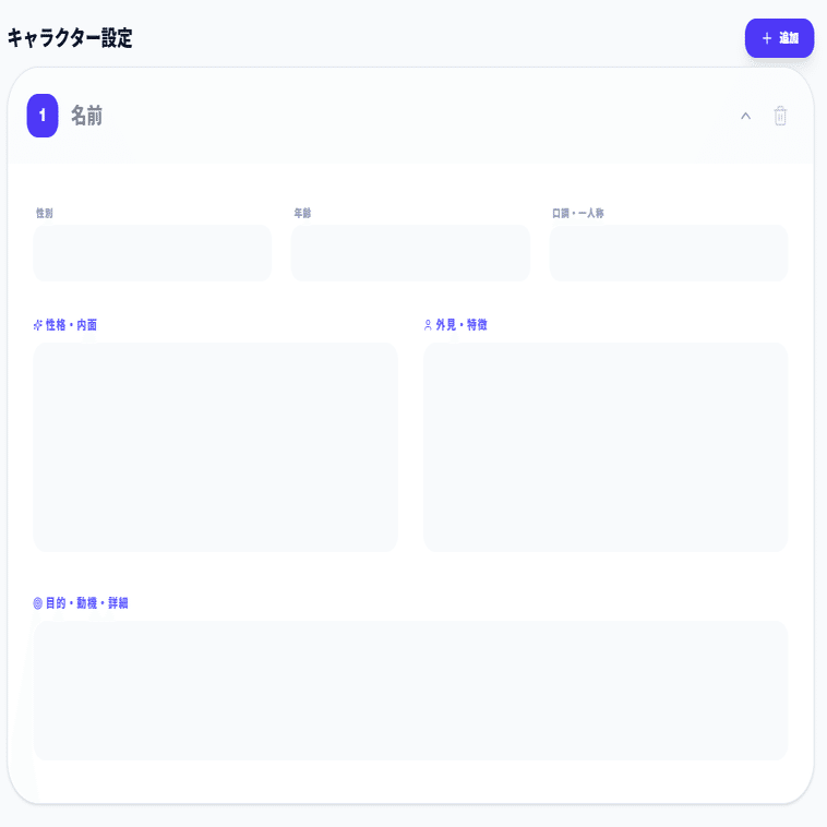 名前や性別、年齢や口調の他、外見や性格などを入力してください。