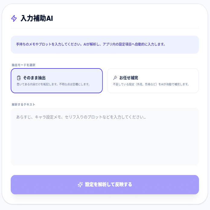 「解析するテキスト」の場所に入力すると、それをAIが自動で設定項目へ入力してくれます。