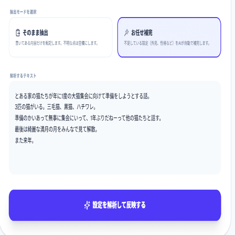 テキスト欄に入っていることを転記し、それ以外の不足している情報をAIがすでにある設定をもとに補完します。