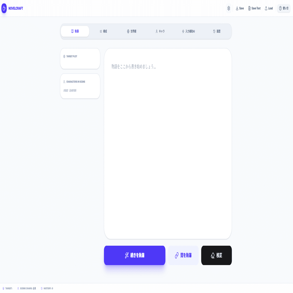 AIの執筆補助が必要だと思ったら、書いて欲しい部分にカーソルをあてて「続きを執筆」もしくは「間を執筆」を押してください。