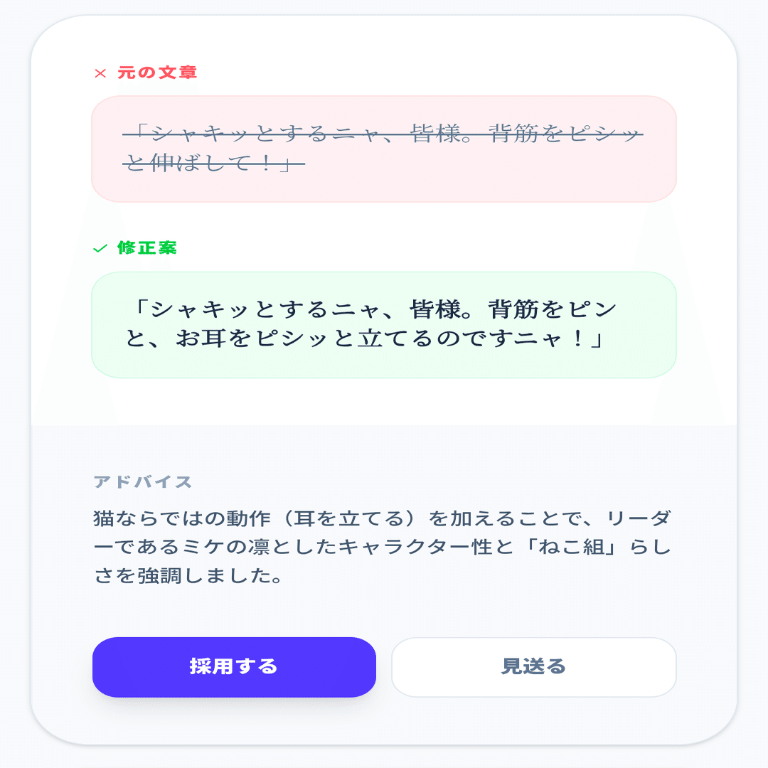(世界観の設定で文体を指定している場合、それと大幅に違うと揺れてしまう可能性がありますので注意してください)